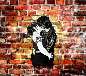 Naomi Lir, a.k.a., BillieJoesEntourage, has created a nice “Christian and Gloria”-type wallpaper from a second photograph taken at the American Idiot opening, a reverse image of the one below of Adrienne and Billie, both of which show off Adrienne’s beautiful tattoos. You can download a large version of the above wallpaper here or by clicking on the image above. Check out more of Naomi’s work at her DeviantArt site as well.