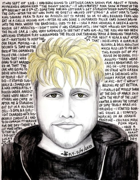 Mike was really excited (more than usual, which is saying a lot for Mike), about the possibility of having the graphic artist, zine writer and musician, Fly, do one of her PEOP sketches of him. Fly, (whose website can be found here) first published PEOPs: Portraits and Stories of People back in 2003. Her PEOP sketches combine drawings of her subject with conversational dialogue from her sketching session with them. The sketch and part of that conversation are then combined into a drawing. Kristy Eldredge summed up PEOPs in her review from 2004: