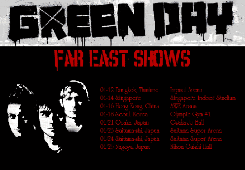 Green Day’s Japanese tour leg began early this morning, Eastern Standard time, and the fan community is hella happy with an acoustic version of “Redundant” that was played at the second encore. There is a video, but I’m going to wait to see if a better one shows up. Tony Anastazi, who I met in London, traveled from London to Osaka to see the tour. He showed up without a ticket after not being able to find a way to purchase them from England. Luckily, he met a Japanese fan on the Green Day Community who is also going to the four shows in Japan who offered to help with the translations and tickets and such. Yay for the Green Day Community, helping each other out all over the world! Party on! Tony has promised to share his memories of the concert at the GDC when he gets a chance.
